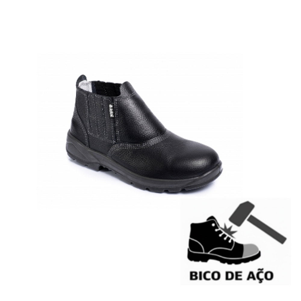 Calçado de segurança, desenho tipo B (bota até o tornozelo), cabedal confeccionado em couro, forro em material não tecido, com fechamento através de elásticos, palmilha de montagem fixada pelo sistema strobel confeccionada em não tecido, com palmilha interna, biqueira de aço, solado a base de PU (poliuretano) bidensidade injetado diretamente no cabedal, resistente ao escorregamento em piso cerâmico com solução detergente e à absorção de energia na região do calcanhar, solado resistente ao óleo combustível.