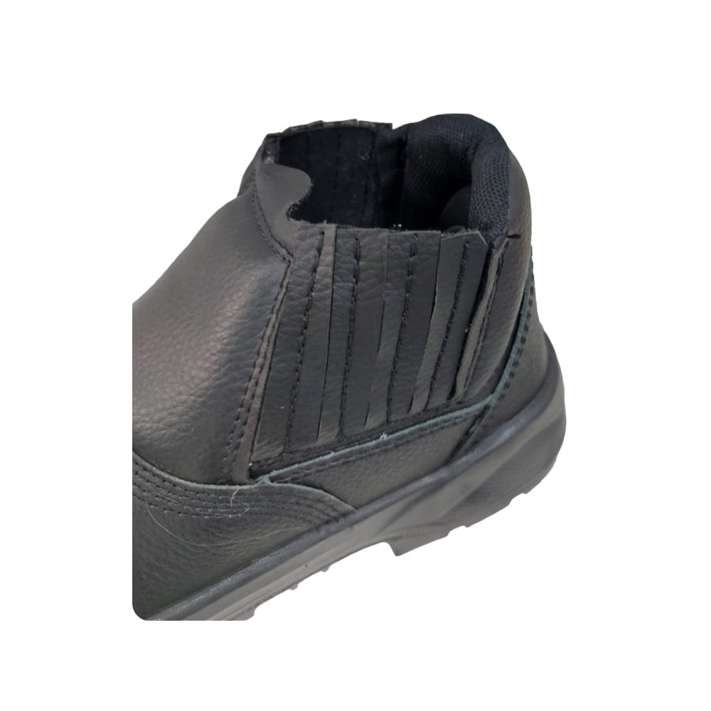 Calçado de ocupacional, tipo botina, com cabedal confeccionado em couro, palmilha de montagem em material não tecido, forro em material não tecido na gáspea e no avesso, sola à base de PU (poliuretano) bidensidade e elástico nas laterais.