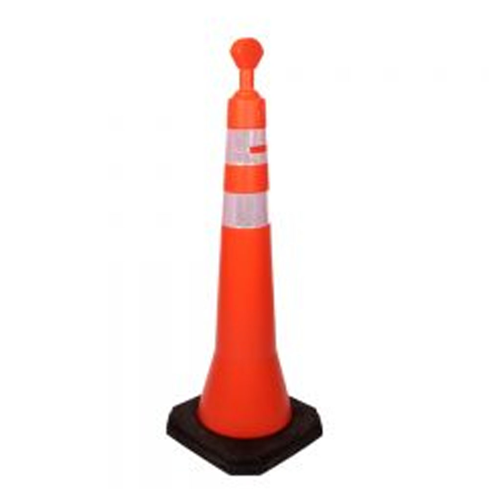 Cone composto com um corpo e base. A base em termoplástico na cor preta, e corpo do cone confeccionado em Polietileno de alta densidade (PEAD) semi–flexível, sistema de acoplagem entre corpo e base garantindo estabilidade, possui 2 faixas refletivas na cor branca para uso noturno.