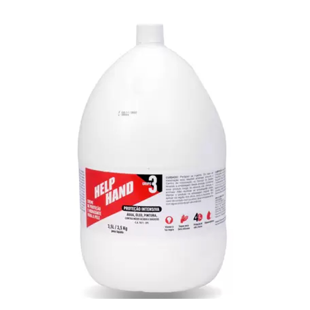 Creme para pele com resistência à água, óleo e pintura. Loção cremosa hidratante e impermeabilizante. O Help Hand Grupo III é um creme hidratante de proteção intensiva para a pele classificado como água resistente, óleo e pintura. Age diretamente no combate de irritações da pele como dermatites e dermatoses, entre outras. Help Hand Grupo III forma uma película de proteção contra os ataques agressivos de produtos solúveis em água, tais como: óleo de corte, óleos emulsificados, pós, tintas, fuligens, adesivos industriais, argamassas (mistura de cimentos, cal, areia e água), solventes, graxas, querosene, gasolina, óleo diesel, verniz, thinner, colas instantâneas e resinas de açúcar. Protege mantendo a sensibilidade ao tato e devolvendo a umidade natural da pele.