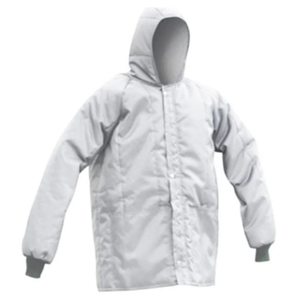 Japona de segurança confeccionada em nylon resinado 300, forro interno com manta térmica de matelassê 180g, punho em malha, capuz, fechamento frontal com botões em metal de pressão, velcro com carcela, até -35 graus.