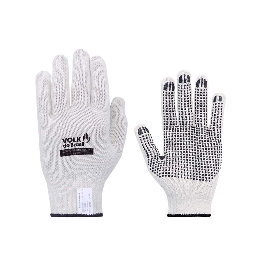 Luva de segurança tricotada em fibras naturais e fibras sintéticas, 7 gauge, pigmentos em PVC na palma, punho com fibras elásticas e acabamento em fibras sintéticas.