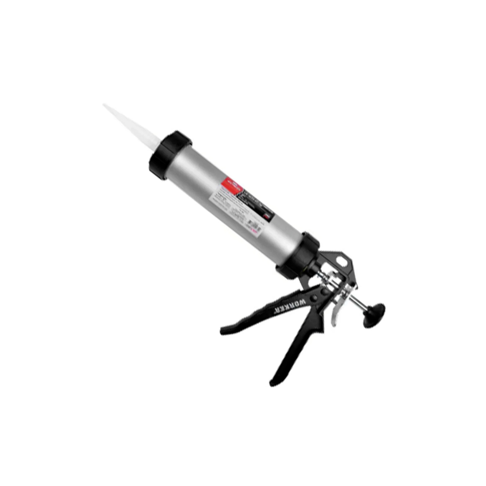 Pistola de Alumínio Aplicadora de Mastique, Adesivos, Selantes e Silicones. Sua estrutura é fechada, sendo indicada para colocação interna de bisnagas. A cada movimento do cabo, a bisnaga (unipacs) são pressionadas até a extremidade fazendo com que o produto sai pelo bico. Acompanha bico dosador.